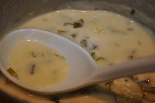 Saute the onions in the olive oil. When they're translucent, add the garlic and saute it for about a minute or two. Add the wine, sherry and broth. Simmer that for a few minutes then remove it from the heat and allow it to cool a bit. Puree it in a blender and pour it back into the pan. (nb: the original recipe called for wiping out the pan then sauteeing the green onions, mushrooms and escargot in 2T of butter. If you want to add those calories, go ahead. I thought it'd be plenty rich without two more tablespoons of butter.) Add the mushrooms, escargot and green onions and simmer until the onions are softened. Add the parsley, chives, thyme, nutmeg and lemon juice. If you've reconstituted the mushrooms, you can add that broth also. Allow to barely simmer until you're ready to serve the soup. Just before you serve it, add the cream and stir to combine.